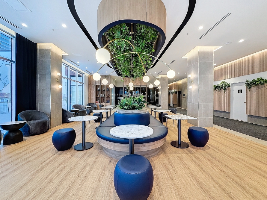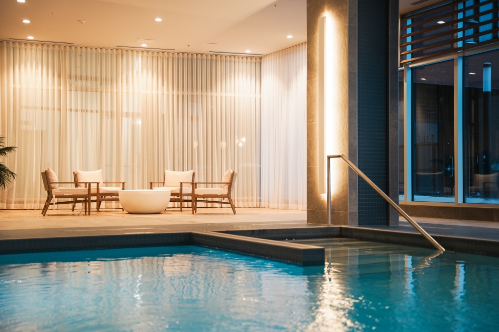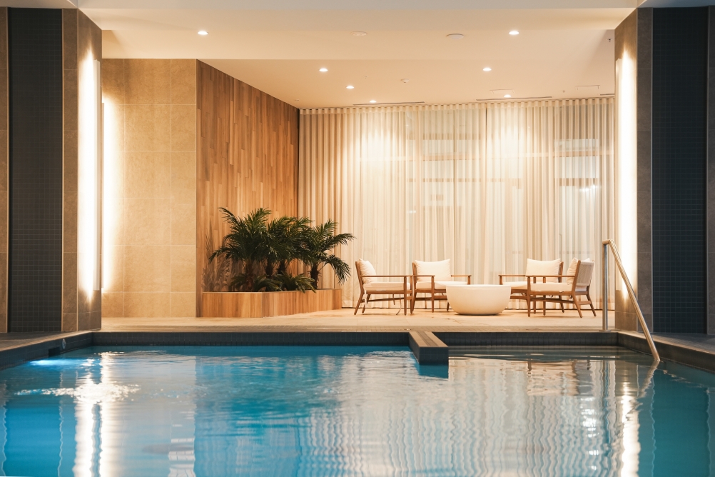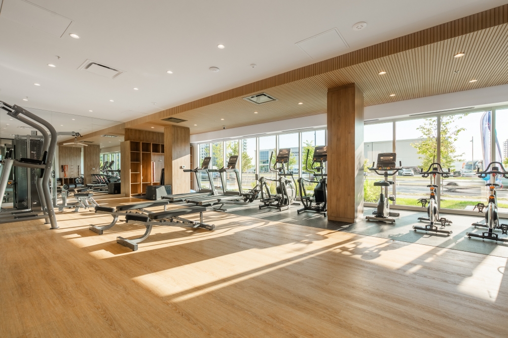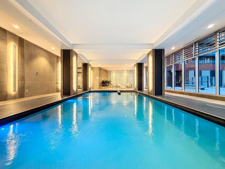 Chaque tour propose des espaces communs soigneusement aménagés. L’ensemble comprend trois halls d’entrée accueillants, deux salles d’entraînement entièrement équipées, une piscine intérieure, une cuisine communautaire, des espaces de cotravail, une aire de jeux pour enfants, un chalet urbain ainsi qu’une spectaculaire terrasse sur le toit. On y trouve également un vaste stationnement intérieur, des espaces de rangement et des supports à vélos.